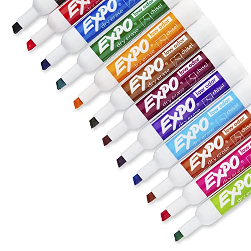 Details: EXPO Low Odor Dry Erase Markers feature vivid ink that?s easy to see from a distance and provides consistent color quality. These chisel tip markers erase cleanly and easily from whiteboards and other non-porous surfaces with a dry cloth or EXPO eraser. The dry erase marker ink is specially formulated to be low odor, making it perfect for use in classrooms, offices and homes. Use your colorful EXPO dry erase markers to track, schedule and present.
